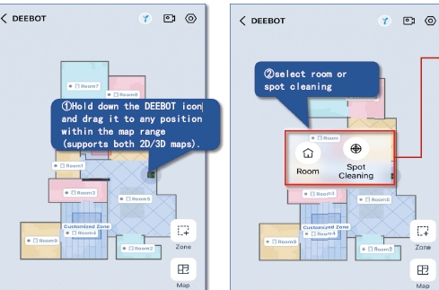 In Worten: Klickt länger auf den Deebot in der Übersicht. Sodann könnt ihr den Deebot in den entsprechenden Raum und dort an die Stelle der Schwerpunktreinigung verschieben. Nach dem Loslassen des Icons werdet ihr gefragt, ob es sich um eine Raumreinigung (Room) oder Schwerpunktreinigung (Spot Cleaning) handelt. Die Schwerpunktreinigung umfasst nur einen vorgegebenen begrenzten Bereich, der ausgiebig - je nach eingestelltem Modus nur saugen oder saugen/wischen etc. durchgeführt wird.